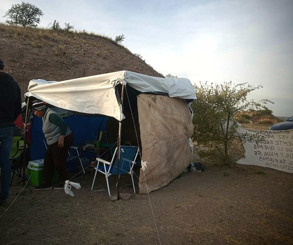 A pocos metros de la entrada a Terrazas del Portezuelo, se encuentra la ‘ruca’ (carpa) que Juana y Noemí armaron, al lado hay un cartel que dice “Señor gobernador, otra vez nos hacemos presente, reclamando con todo lo que nos prometió y nada se cumplio”.