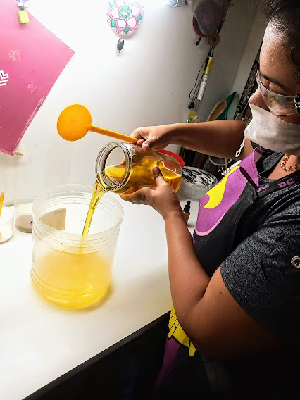 ¿Cómo es el arte de transformar al aceite de cocina usado en jabón? El primer paso es conseguir la materia prima, para ello Silvina recolecta el aceite de cocina usado en diversos locales gastronómicos, además ofrece un descuento del 10% para aquellos clientes que le dan su aceite usado. Luego ese aceite se somete a un proceso de filtrado y purificación para eliminar los restos de comida y las impurezas, el filtrado se repite hasta que el aceite queda apto para elaborar los jabones.